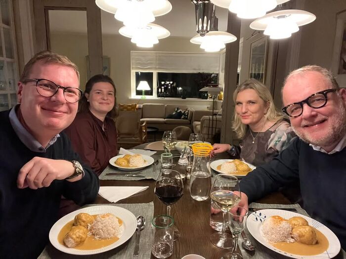 Søren Windell og jeg er enige om, at boller i karry er vores yndlingsret. I aften havde Søren og Sara inviteret Jane og mig på de dejligste boller i karry – som Søren havde lavet fra bunden.